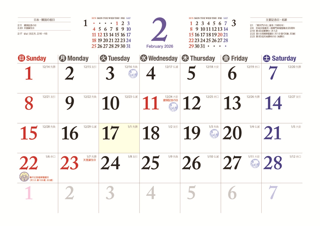 の安侍日や家庭連合の主要な記念日、日韓の祝日が一目で確認できて、とても便利です。