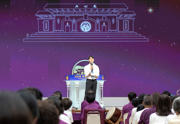 ▲第1397回天心苑特別徹夜精誠でメッセージを語られる文信出様(9月23日)