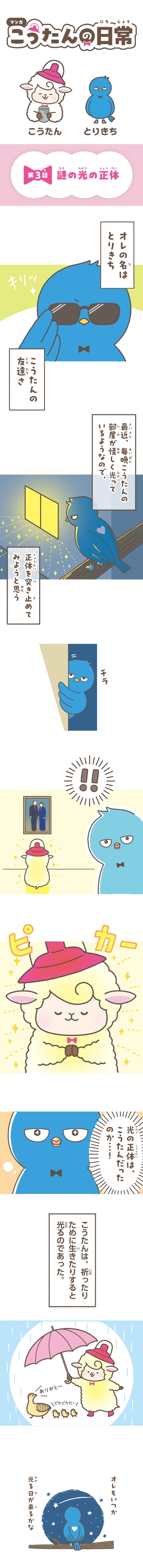印刷 マンガ「こうたんの日常」 NEW いいね(2) 2025年11月01日 第3話「謎の光の正体」 光言社のマスコットキャラクターとして生まれた、小さなひつじ「こうたん」。 その知られざる一面や、光言社のイチオシコンテンツを紹介していくよ! いいね(2) « 前の記事へ 戻る