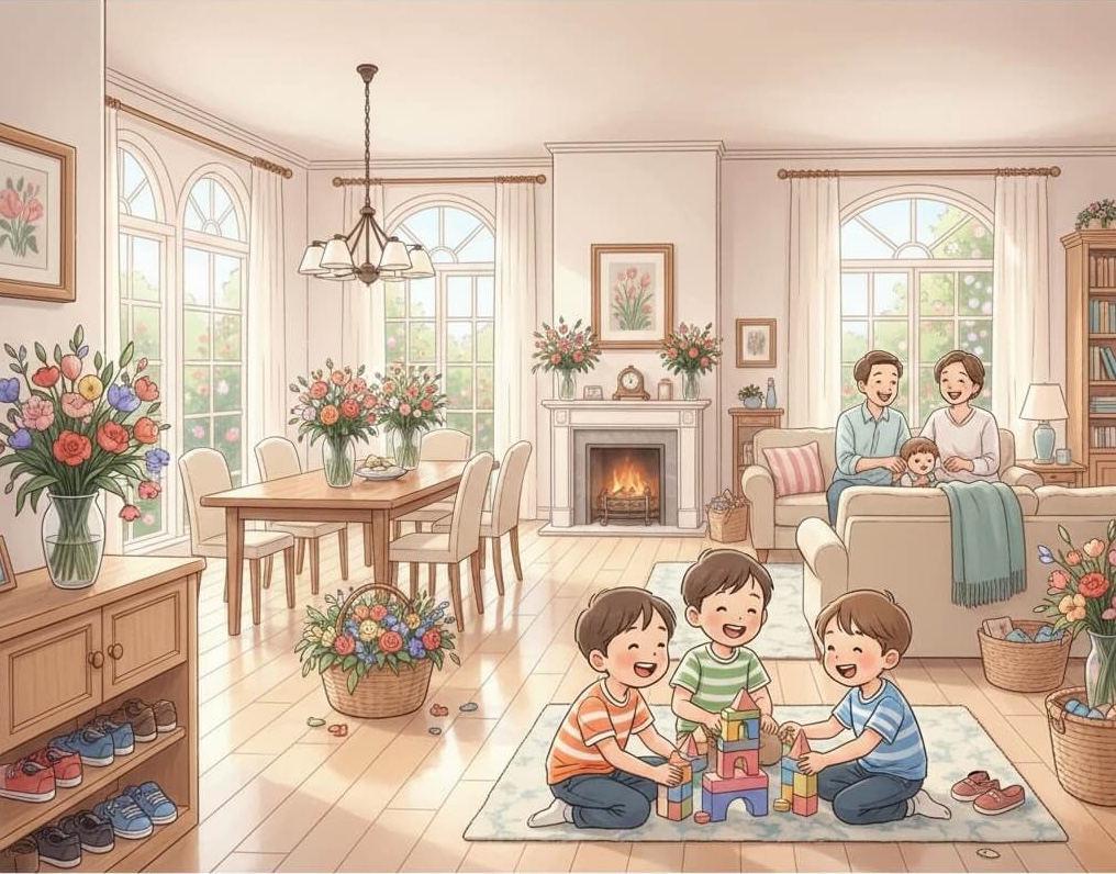・靴がそろえてある ・家族がいる ・仲良く遊ぶ ・花がたくさん飾ってある