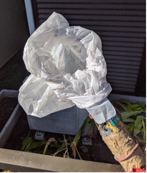 我が家では、写真のように物干し竿に針金を輪っか状に取り付け、そこにビニール袋を通して「特製キャッチ網」を作っています。その輪っかに柿の実を引っ掛けて、袋の中にポトンと落としてキャッチする……これが、なかなか楽しい作業なのです。