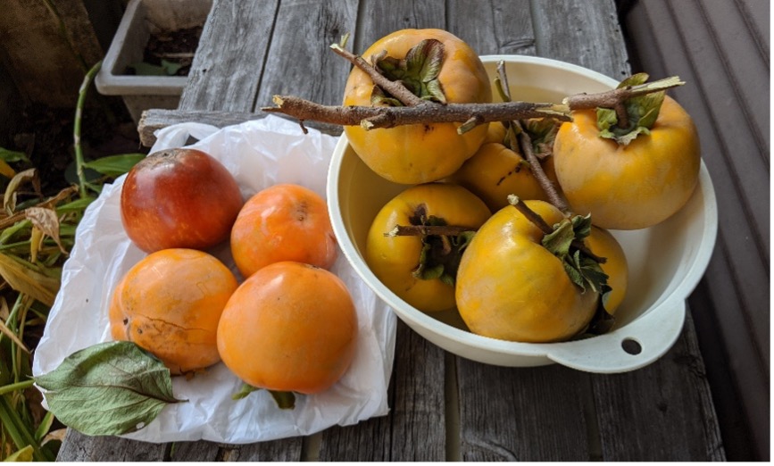 実は、うちの柿はほとんどが渋柿。左側は甘いのですが、右側の柿は渋くてそのままでは食べられません。そこで、今年も「干し柿」を作ることにしました。