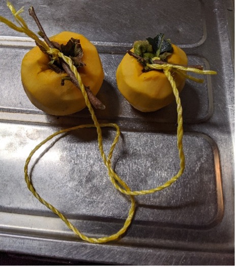 まず皮をむき、二つ一組にして紐で結びます。このとき、結びやすくするためにヘタの部分の枝を少し残しておくのがコツです。その後、熱湯に数秒程度くぐらせます。こうすることでカビの発生を防ぐことができるのです。