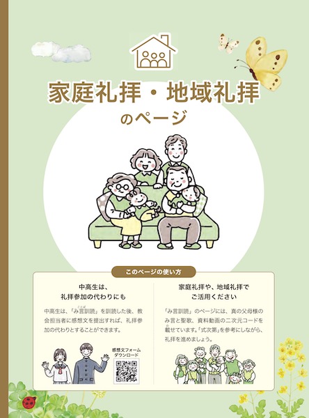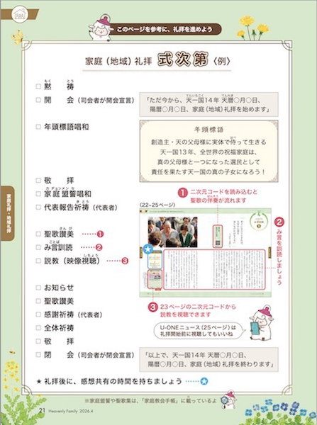 礼拝の式次第は、『Heavenly Family』の中の「家庭礼拝・地域礼拝のページ」に毎月、掲載されています。
