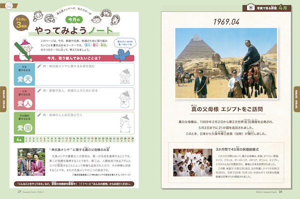 『Heavenly Family』では、家庭礼拝や地域礼拝をサポートできるよう、4月号からはさらに、「写真で見る摂理」と「今月のやってみようノート」もスタートしました。