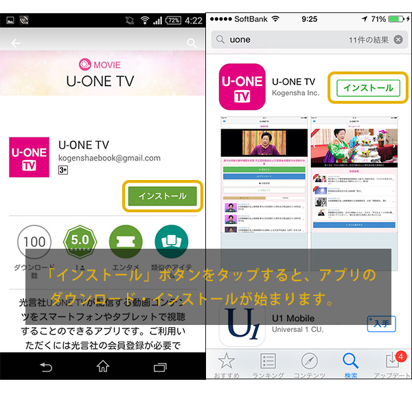 iOS端末をお使いの方は「入手」ボタンをタップすると「インストール」ボタンに変わります。アンドロイド端末をお使いの方は、表示されたU-ONE TVアプリのアイコンをタップすると、インストール画面に変わり「インストール」ボタンが表示されます。
