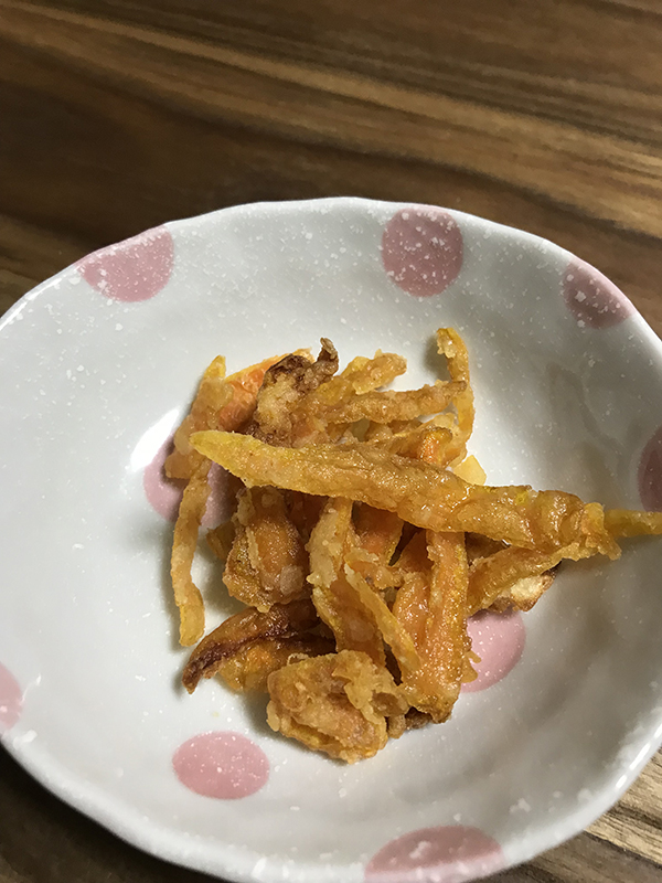 ほほ…(^^) これはぽんまるちゃんの好きな、ニンジンの皮チップスに変身じゃ!