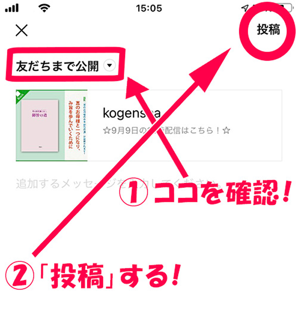 7. 公開範囲を確認したら、右上の投稿ボタンを押すだけ。