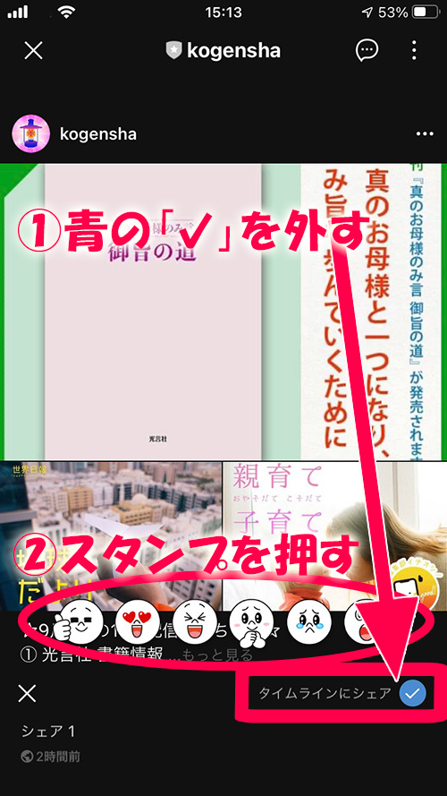 2. するとスタンプが選べるようにたくさん出てきますが、まず右横の「タイムラインにシェア」をタップし、チェックを外します。