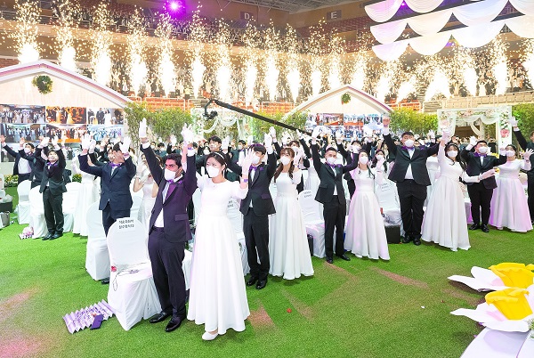 午前9時からは、HJグローバルアートセンター(清心平和ワールドセンター)で「2022天地人真の父母 孝情天宙祝福祝祭」が開催され、全世界70カ国から2100組の新郎新婦が参加しました。