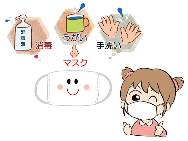 A:①こまめな手洗い ②うがい ③必ずマスクを着ける ④三密(密閉・密集・密接)をさける ⑤室内の換気をする ⑥消毒、などをすることがポイントです。