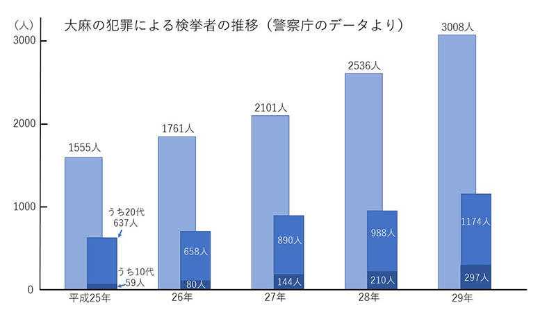 10代の中には、高校生53人、中学生2人が含まれます。高校生は平成25年が10人、26年に18人、27年に24人、28年に32人、そして29年が53人ですから、大麻の浸透ぶりがうかがえます。