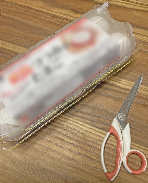 1. 卵のパックの、開け口とは反対側の辺にハサミを差し込み、切り離す。