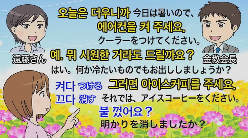 電気製品や火などを「つける」と言うときには「キョダ」、「消す」は「クダ」を使います。「今日は暑いので、クーラー(エアコン)をつけてください」は、「オヌルン トウニカ エオコヌル キョヂュセヨ」と言います。「(部屋の)明かりを消しましたか?」であれば、「プル コッソヨ?」となります。