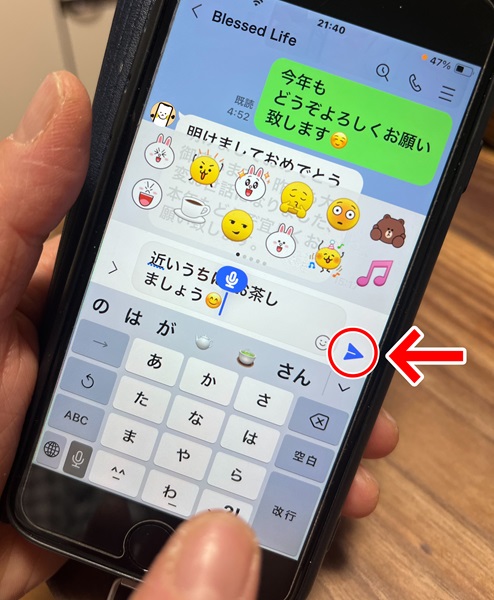 4. 文章が完成したら、送信マークをタップして送る。