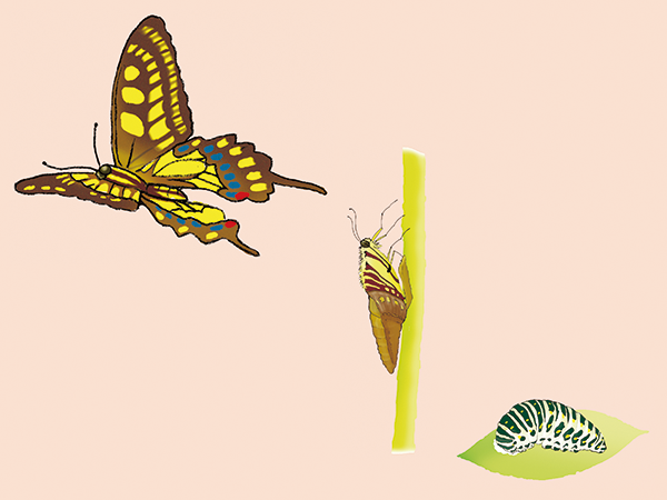 ところが青虫が、やがてサナギとなり、いったん殻を脱いで蝶となれば、空中を自由に飛び交いながら、香りの良い花や甘い蜜を自由に味わうことができます。地上生活と死後の世界は、この青虫と蝶の関係に似ています。