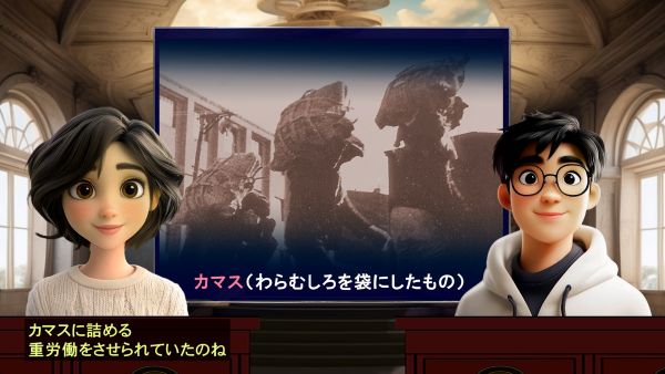 囚人たちは、山のように積み上げられた肥料の原料である硫安をカマスに詰める重労働をさせられていたのね。