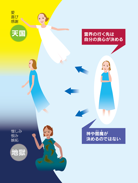 そのような天国に行くか、あるいは地獄に行くか、それともその中間にある霊界に行くか、それを決めるのは神や閻魔(えんま)ではなく、実は自分自身の中で、良心にしたがって培われてきた意識なのです。憎しみや恨みを持った人は、明るく光り輝く天国にいることがかえって苦痛となり、それを避けるために自ら選択して地獄へと行くのです。