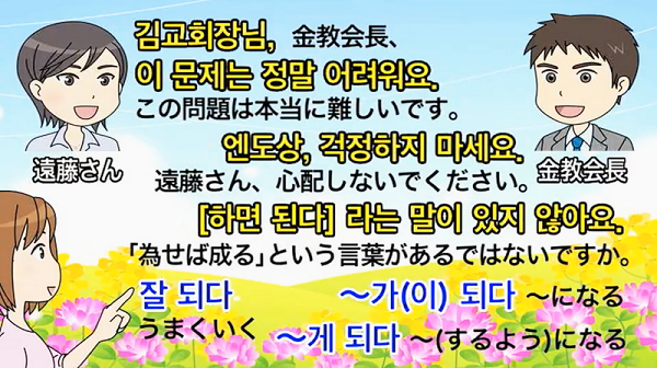 難しい問題に取り組む遠藤さんに対して、金教会長が「心配しないでください。為せば成る(하면 된다〈ハミョン テンダ〉)という言葉があるではないですか」と言って励まします。