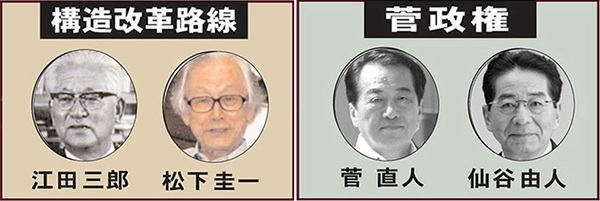 というのも、菅直人元首相は自著で「松下(圭一)理論を現実の政治の場で実践する」(『大臣 増補版』)と明記。首相所信表明演説でも、「松下思想は私の政治理念の原点」と掲げたように、松下圭一法政大名誉教授の「不肖の弟子」と称するほどの確信犯的「構造改革派」だったからです。