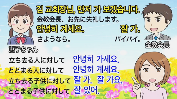 「さようなら」は、その場から立ち去る人に対しては「안녕히 가세요(アンニョンヒ カセヨ)」を、その場にとどまる人に対しては「안녕히 계세요(アンニョンヒ ケセヨ)」と表現します。