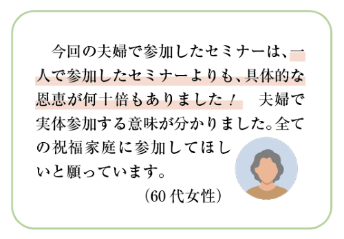 「祝福夫婦宿泊セミナー」には、6つの特徴があります。