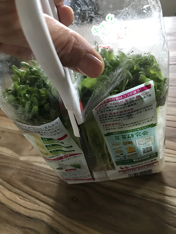 1. 豆苗のパッケージを、底から10センチぐらい残して切り取る。